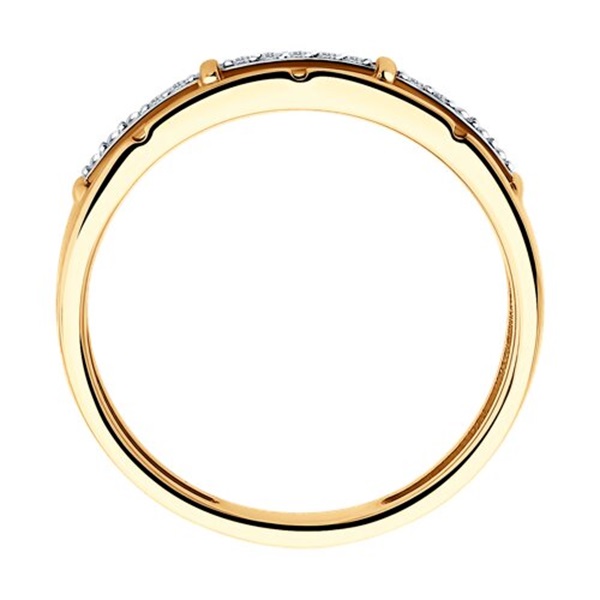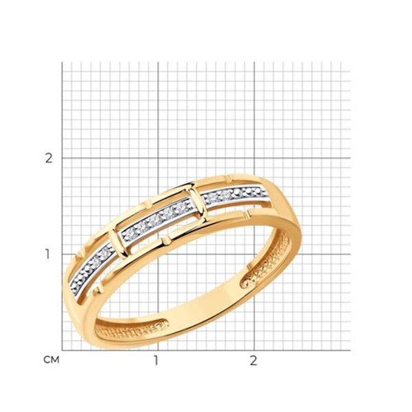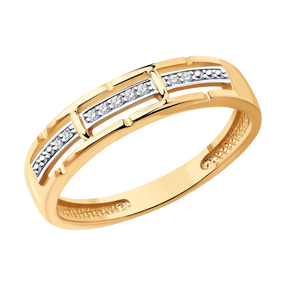 Кольцо из красного золота 585 пробы выполнено в современном дизайне и украшено дорожками с прозрачными бриллиантами. Привлекательное кольцо с изумительным блеском драгоценных камней смотрится стильно и элегантно, и отлично впишется в базовые повседневные образы. Приобретайте ювелирное украшение по выгодным ценам в магазинах Мир Золота.