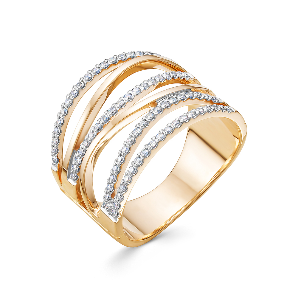 Объемное кольцо великолепного ювелирного дизайна выполнено из красного золота 585 пробы с дорожками сверкающих бриллиантов. Изысканное широкое кольцо придется по вкусу поклонницам крупных и заметных ювелирных украшений. Кольцо действительно роскошно смотрится и подчеркивает индивидуальность, и станет эффектным завершающим штрихом в различных стильных образах владелицы. Приобретайте кольцо по выгодным ценам в магазинах Мир Золота.