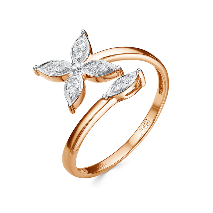 Очаровательное кольцо открытого типа выполнено из красного золота 585 пробы с сияющими бриллиантами. Флористический дизайн с изумительным сиянием драгоценных камней привлекает внимание, и позволит создать нежный романтичный образ, подчеркнув красоту и женственность обладательницы. Приобретайте прекрасное кольцо в подарок по выгодным ценам в магазинах Мир Золота.