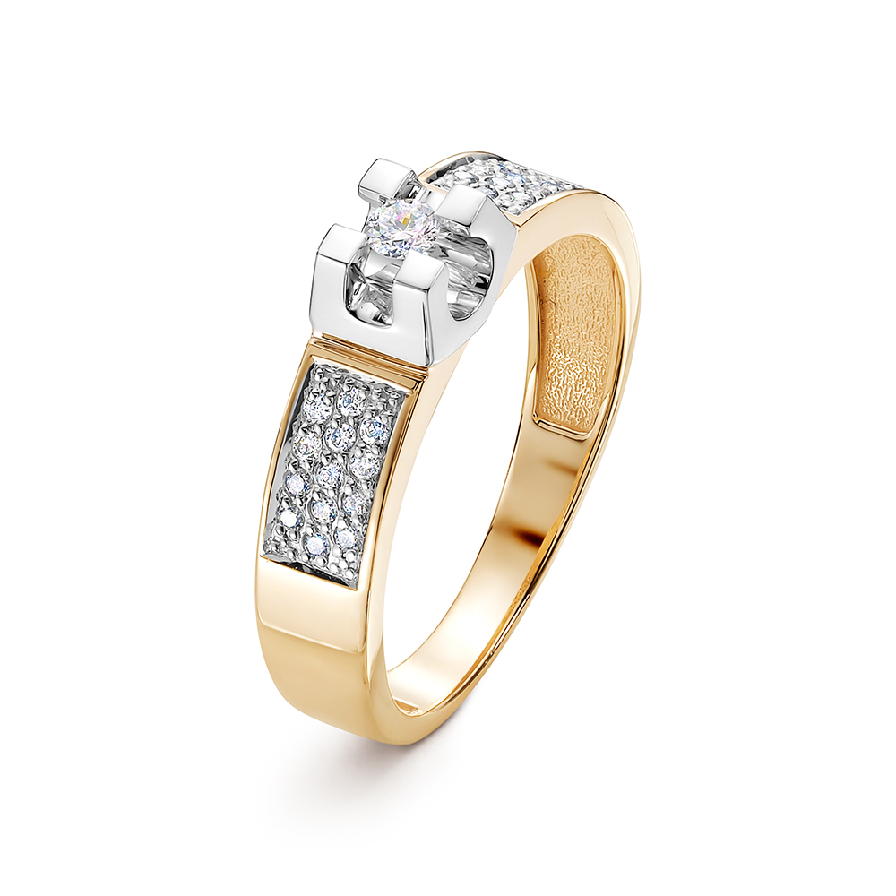 Ослепительное золотое кольцо 585 пробы украшено сверкающими бриллиантами. Блистательное кольцо со множеством бриллиантов в обрамлении стильных вставок из белого золота создает потрясающий эффект великолепия, сияния и блеска. Очень красивое украшение идеально подойдет к любому образу. Приобретайте кольцо по выгодным ценам в магазинах Мир Золота.