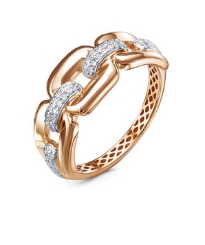 Эффектное кольцо в форме звеньев цепи из красного золота 585 пробы с дорожками из 52 прозрачных бриллиантов. Кольцо в современном динамичном дизайне для исключительно стильных образов оценят поклонников трендов. Лаконичное и не скучное украшение, подойдет к любому гардеробу и сделает образ ярче и элегантней. Приобретайте кольцо выгодно в магазинах Мир Золота.