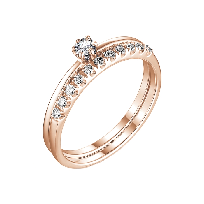 Элегантное наборное кольцо из красного золота 585 пробы с бриллиантами в изысканном дизайне. Декоративная часть кольца оформлена центральным камнем и изящной бриллиантовой дорожкой. Такое украшение поможет создать поистине ослепительный вечерний образ. Приобретайте очаровательное кольцо по выгодным ценам в магазинах Мир Золота.