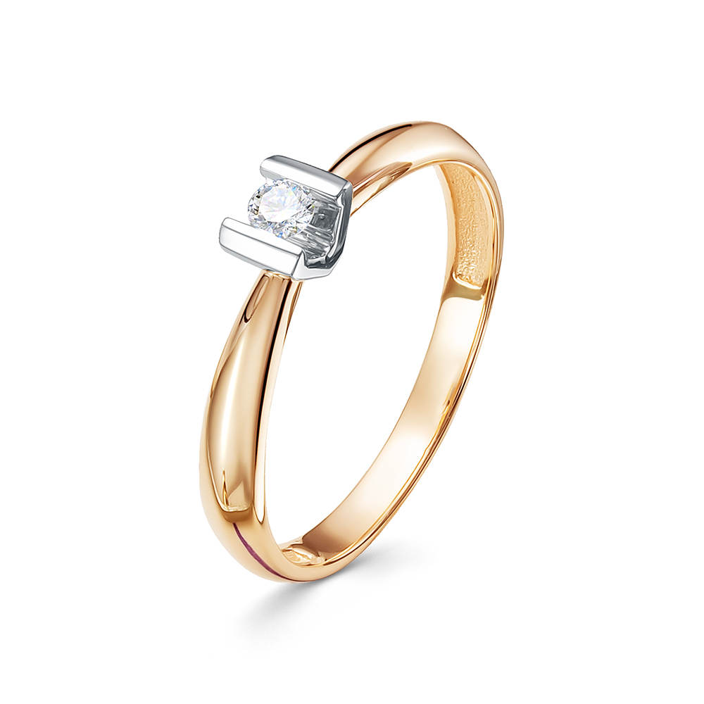 Привлекательно женское кольцо из красного золота 585 пробы классического дизайна с одним бриллиантом. Блистательный бриллиант стильно оформлен вставкой из белого золота. Это нежное кольцо идеально для выражения своих чувств. Оно будет отлично смотреться как сольным украшением, так и дополнением к обручальному. Приобретайте кольцо по выгодным ценам в магазинах Мир Золота.