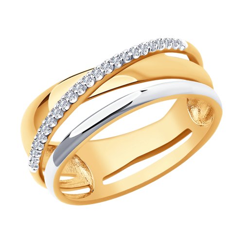 Стильное кольцо безупречного ювелирного исполнения из красного и белого золота 585 пробы с дорожкой сияющих бриллиантов воплощает в себе элегантность и изысканность. Украшение великолепно смотрится на руке, благородный блеск золота выгодно подчеркивает изысканное сияние и красоту драгоценных камней. Актуальный дизайн гармонично дополнит современные образы, и отлично впишется в повседневный и вечерний гардероб. Приобретайте кольцо выгодно в магазинах Мир Золота.