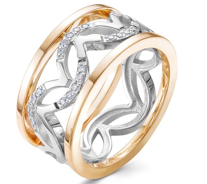 Великолепное кольцо выполнено из красного и белого золота 585 пробы с дорожками сверкающих бриллиантов. Объемное кольцо с драгоценным блеском натуральных камней смотрится роскошно и изысканно, и придется по вкусу любительницам крупных ювелирных украшений. Кольцо подчеркивает индивидуальность, и станет эффектным завершающим штрихом в различных образах обладательницы. Приобретайте украшение по привлекательной цене в магазинах Мир Золота.