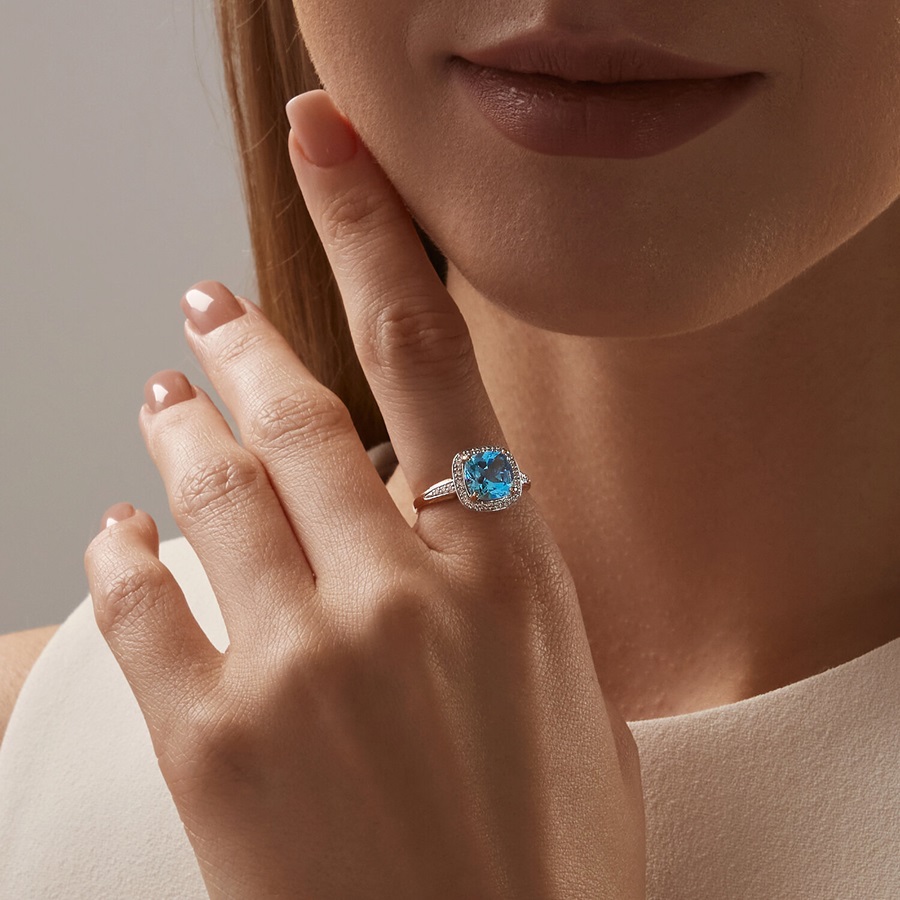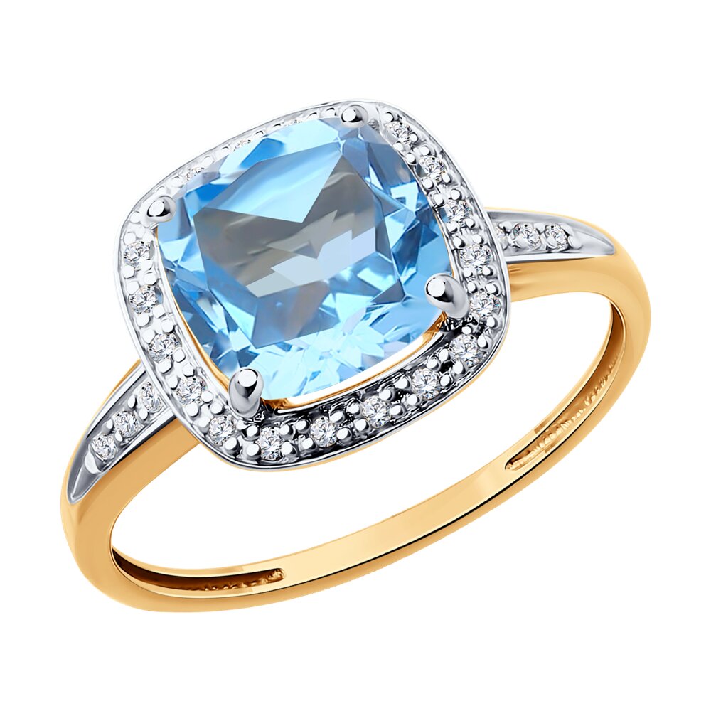 Кольцо из красного золота 585 пробы с превосходным голубым топазом привлекательной формы огранки в окружении сияющих бриллиантов не оставит женщину равнодушной. Элегантное украшение с неповторимым блеском крупного топаза великолепно смотрится на руке, и станет заметным акцентом женственного образа. Приобретайте ювелирное кольцо в подарок по выгодной цене в магазинах Мир Золота.