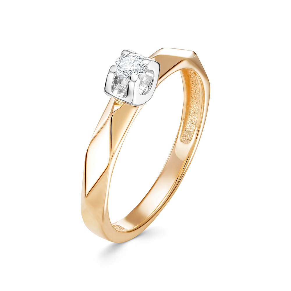 Изумительное нежное кольцо из красного золота 585 пробы с одним бриллиантом. Вставка из белого золота подчеркивает сияние драгоценного бриллианта. Самодостаточный аксессуар идеален для офисных повседневных, а также праздничных образов. Приобретайте очаровательное кольцо по выгодным ценам в магазинах Мир Золота.