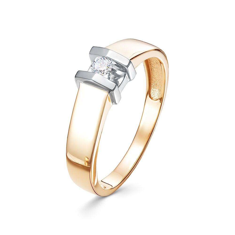 Привлекательное кольцо в классическом стиле из красного золота 585 пробы с одним бриллиантом. Сверкающий прозрачный бриллиант оригинально оформлен вставкой из белого золота. Кольцо станет изысканным дополнением как к повседневному образу, так и к праздничному мероприятию. Приобретайте кольцо по выгодным ценам в магазинах Мир Золота.