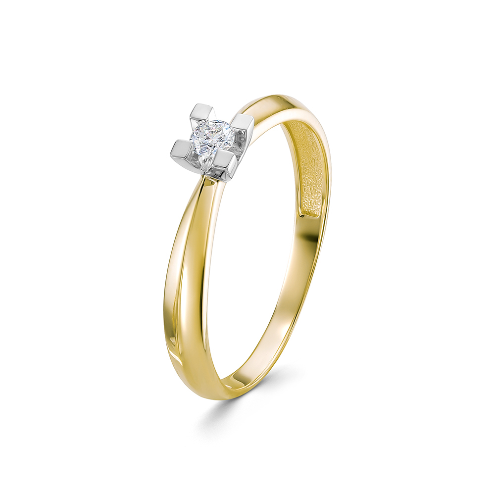 Утонченное кольцо из желтого золота 585 пробы декорировано эффектной вставкой из белого золота с натуральным бриллиантом. Украшение классического стиля с изысканным акцентом драгоценного камня станет прекрасным подарком, и будет отлично сочетаться и со строгим деловым костюмом, и с элегантным вечерним нарядом. Приобретайте украшение по выгодным ценам в магазинах Мир Золота.