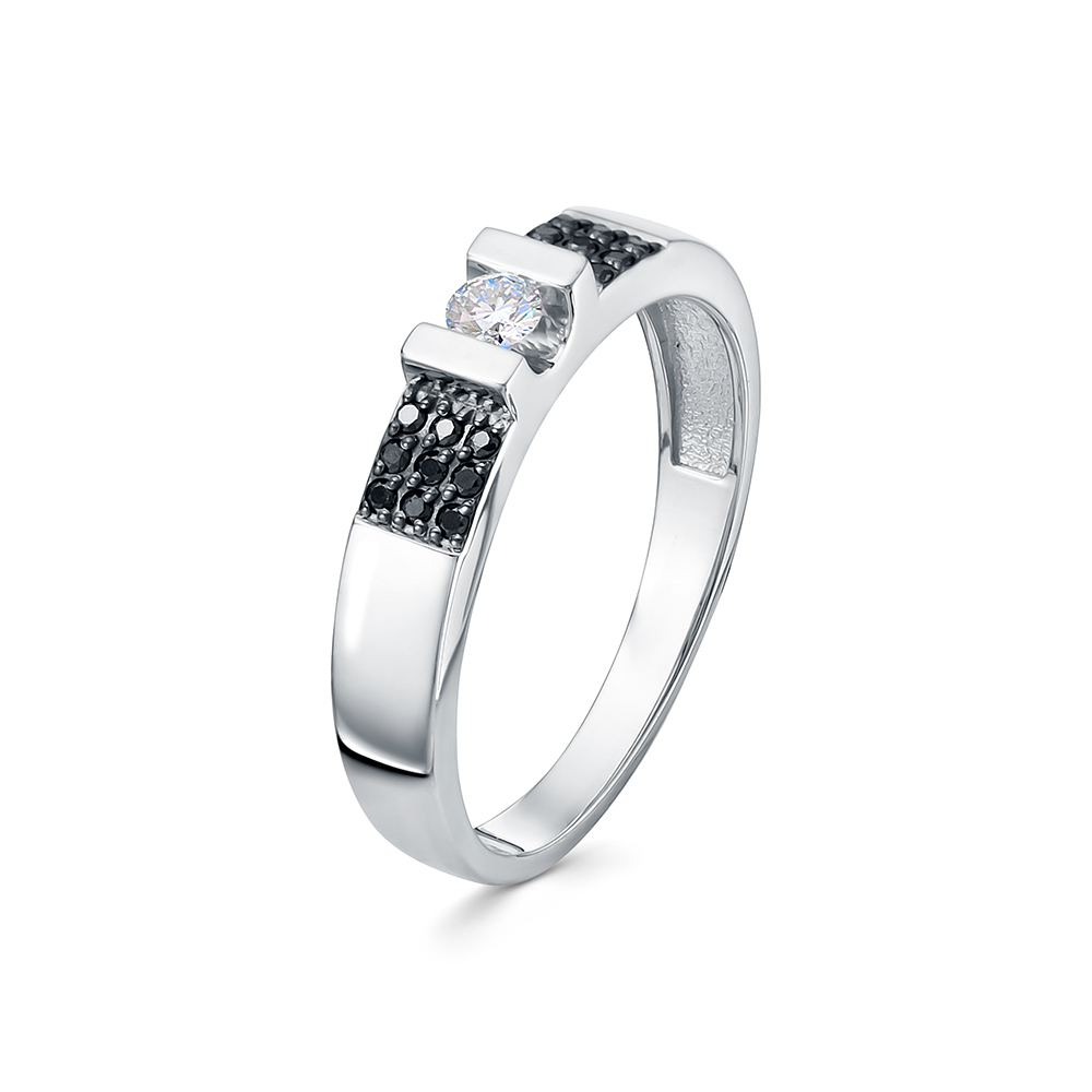 Кольцо из белого золота 585 пробы выполнено в современном дизайне и декорировано прозрачным и черными бриллиантами. Контрастное сочетание холодного оттенка золота с сияющим акцентом прозрачного бриллианта и завораживающего блеска черных камней создают яркий выразительный образ украшения. Приобретайте стильное кольцо по выгодным ценам в магазинах Мир Золота.