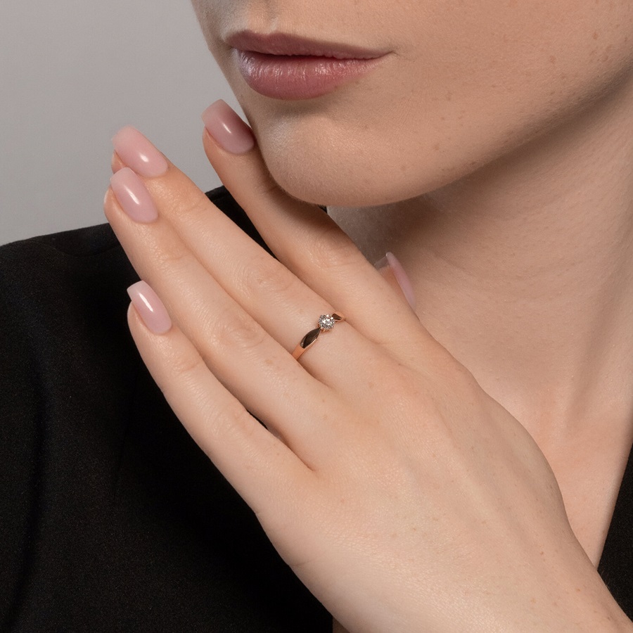 Элегантное кольцо из красного золота 585 пробы с великолепным бриллиантом станет идеальным дополнением женского образа. Утонченное украшение изящно и привлекательно смотрится на руке, изысканный блеск драгоценного камня подчеркнет женственность и чувственность владелицы. Приобретайте кольцо в подарок по выгодной цене в магазинах Мир Золота.