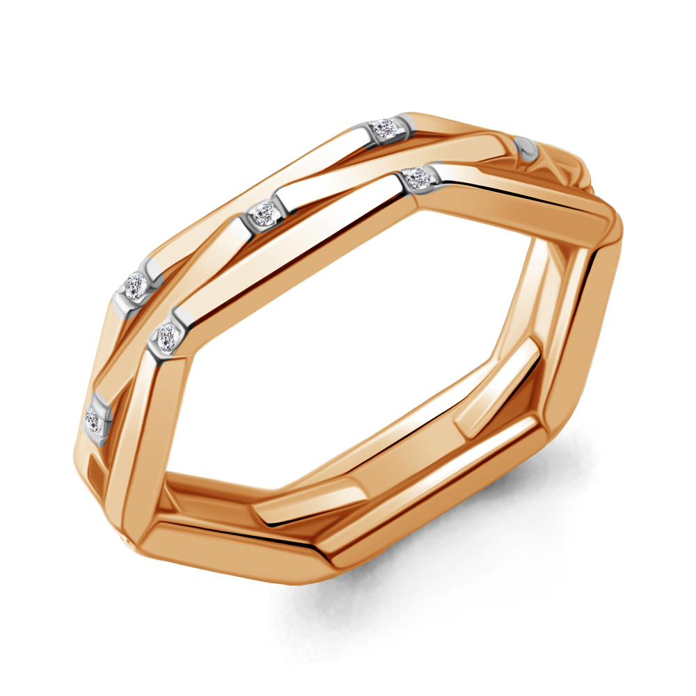 Кольцо из золочёного серебра 925 пробы с прозрачными бриллиантами выполнено в современном ювелирном дизайне. Стильный аксессуар с сочетанием золотистого оттенка металла и кристального сияния драгоценных камней сделает женский образ более изысканным и привлекательным. Приобретайте ювелирное украшение для себя или в подарок по выгодной цене в магазинах Мир Золота.