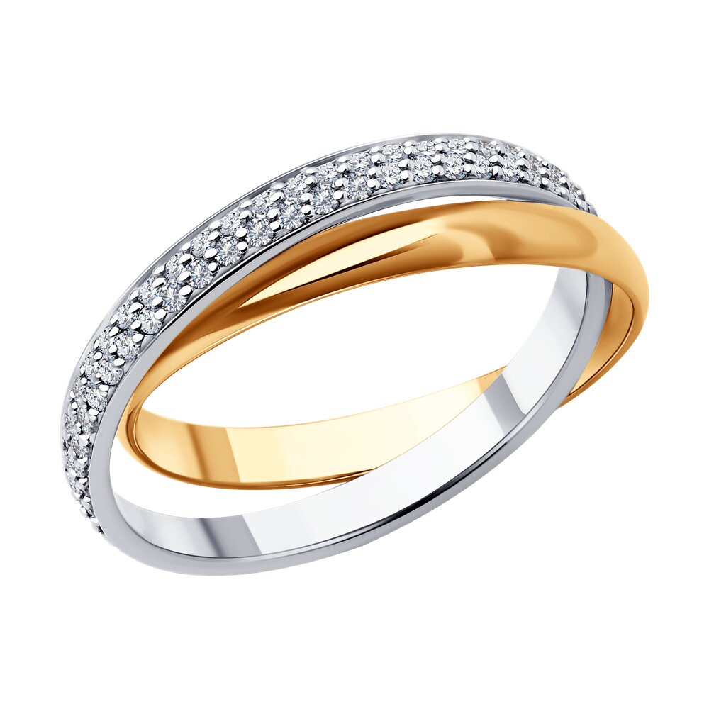 Стильное кольцо современного ювелирного дизайна выполнено из комбинированного золота 585 пробы с натуральными бриллиантами. Актуальный дизайн из двух переплетающихся колец из красного и белого золота и переливчатым блеском драгоценных камней не останется незамеченным, и будет эффектно смотреться с повседневными и вечерними нарядами. Приобретайте изысканное украшение по выгодным ценам в магазинах Мир Золота.