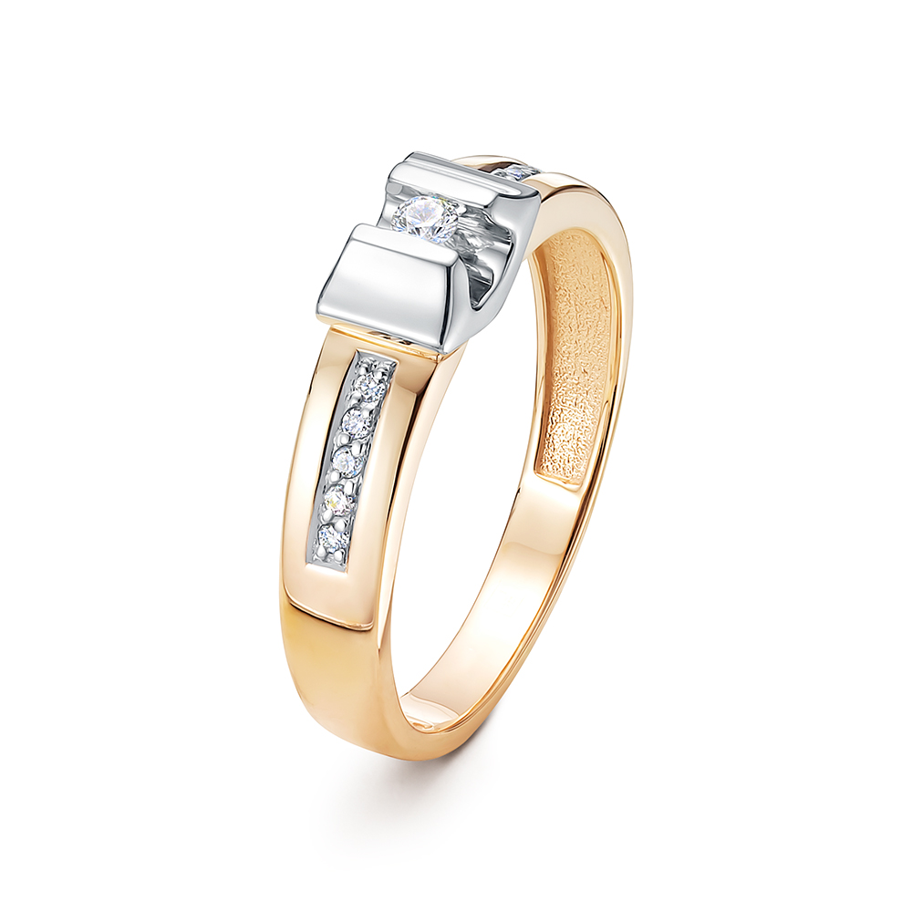 Оригинальное кольцо из красного золота 585 пробы с бриллиантами в современном стиле. Кольцо украшено 11 бриллиантами классической огранки в обрамлении элементов из белого золота. Это стильное кольцо выгодно подчеркнет индивидуальность образа его обладательницы. Приобретайте кольцо по выгодным ценам в магазинах Мир Золота.