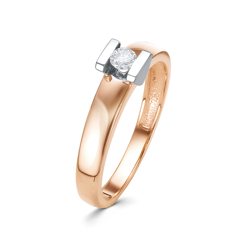 Универсальное кольцо классического дизайна из красного золота 585 пробы с одним прозрачным бриллиантом. Сияющий драгоценный бриллиант стильно оформлен вставкой из белого золота. Это превосходное помолвочное кольцо с бриллиантом идеально для эффектного выражения своих чувств. Приобретайте кольцо по выгодным ценам в магазинах Мир Золота.