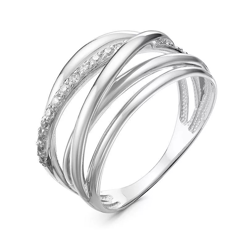 Изысканное кольцо из белого золота 585 пробы выполнено в оригинальном современном дизайне и украшено дорожкой бриллиантов. Декоративная часть украшения в виде переплетения колец изящно украшена бриллиантовой дорожкой из 15 кристальных камней. Стильный аксессуар с благородным блеском бриллиантов станет прекрасным дополнением классического и вечернего образа. Приобретайте кольцо по выгодным ценам в магазинах Мир Золота.