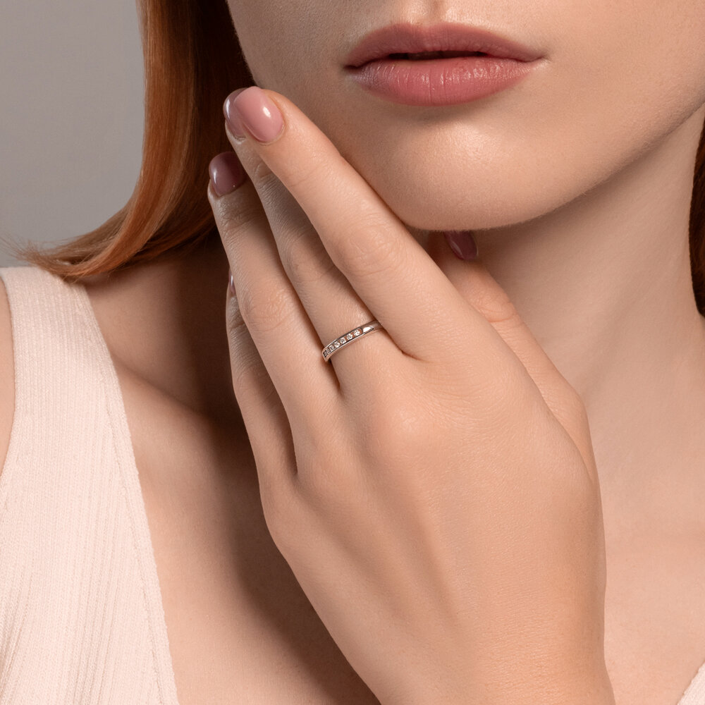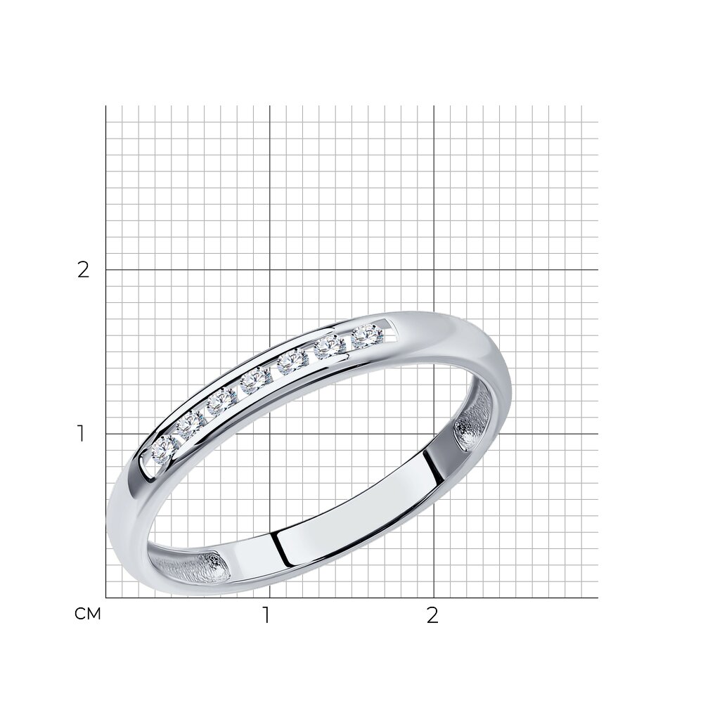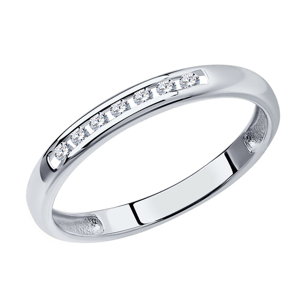 Утонченное кольцо из белого золота 585 пробы с очаровательными бриллиантами. Кольцо украшено дорожкой из 7 прозрачных бриллиантов классической эффектной огранки. Стильное украшение станет универсальным и любимым аксессуаром на каждый день, и прекрасно дополнит повседневные и праздничные образы. Приобретайте кольцо по выгодным ценам в магазинах Мир Золота.