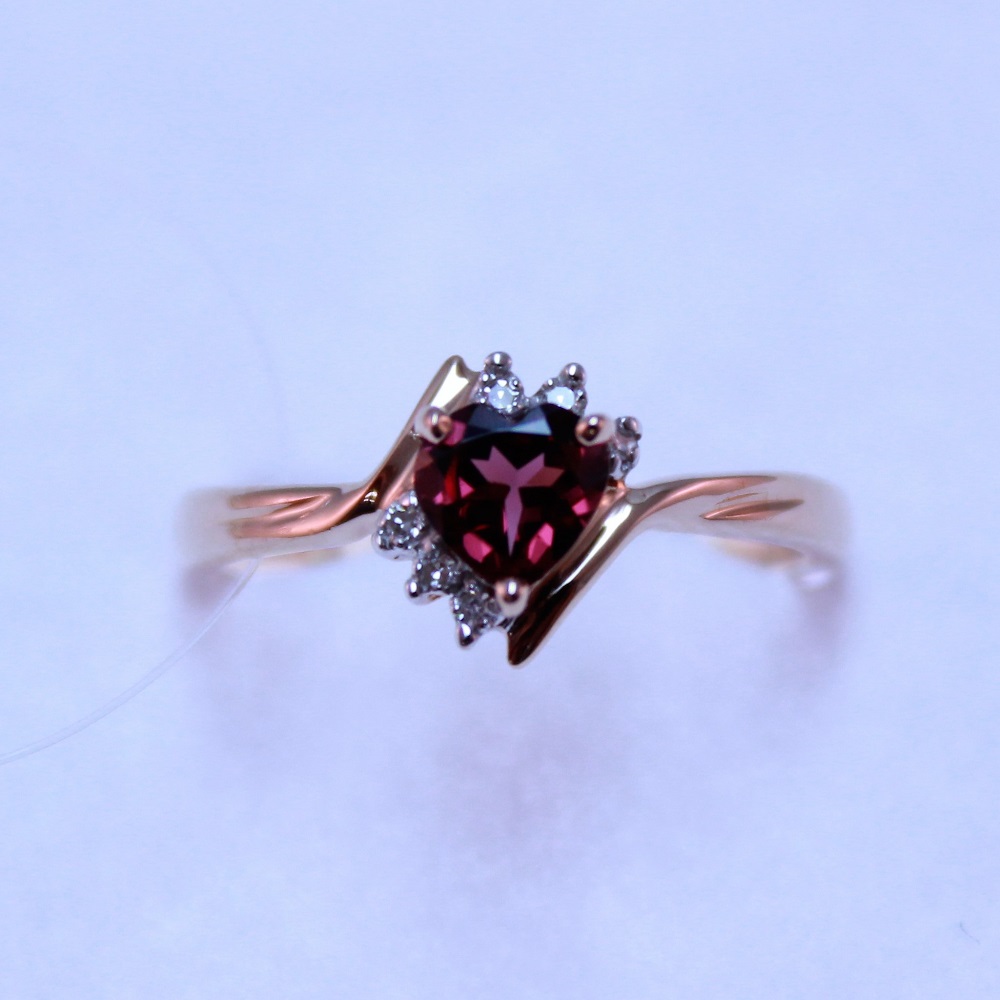 Кольцо изящного ювелирного дизайна из красного золота 585 пробы украшено натуральным родолитом в форме сердца и кристальными бриллиантами. Украшение с изумительным блеском камней поможет создать привлекательный нежный образ, и подарит романтичное настроение. Приобретайте кольцо в подарок для своих любимых по выгодной цене в магазинах Мир Золота.