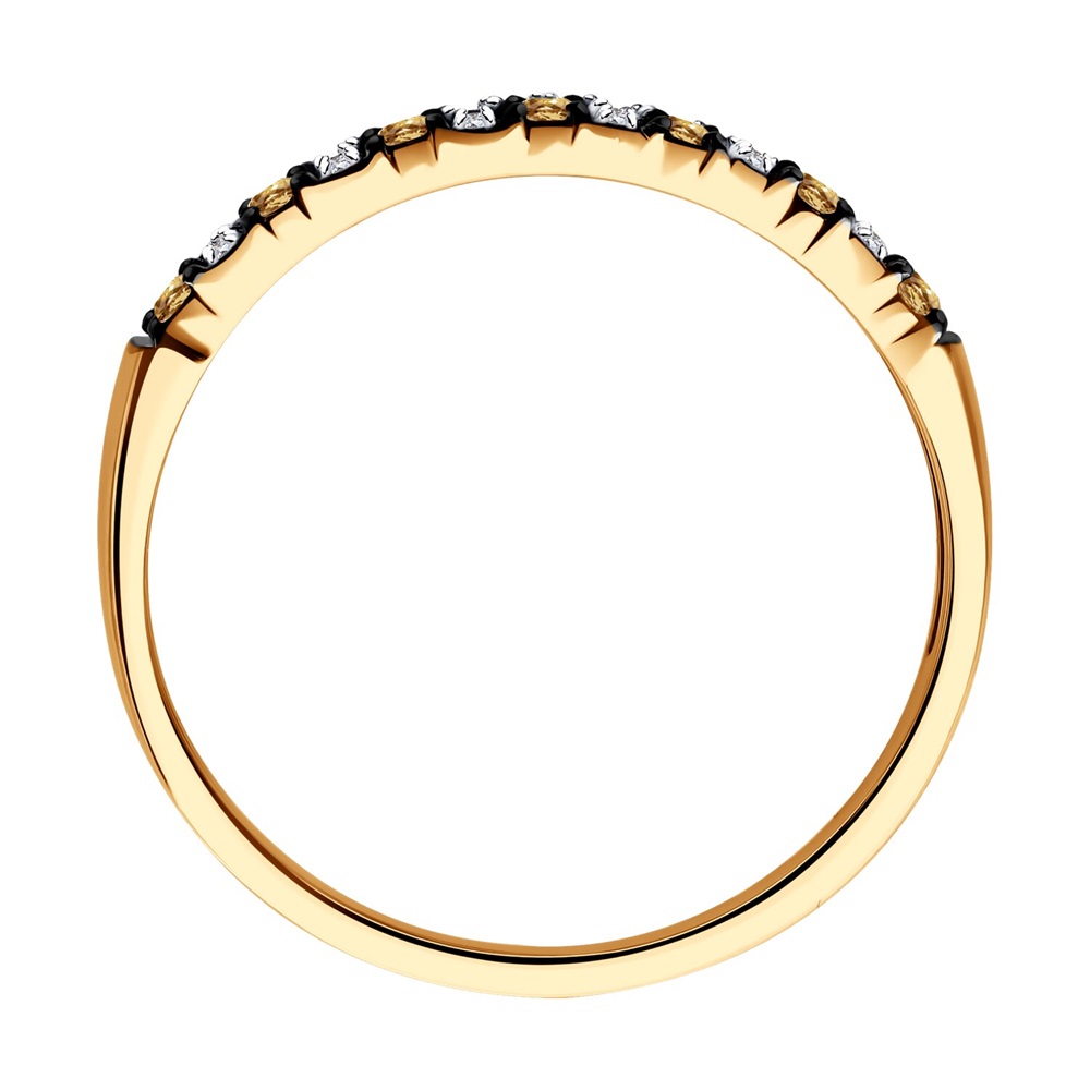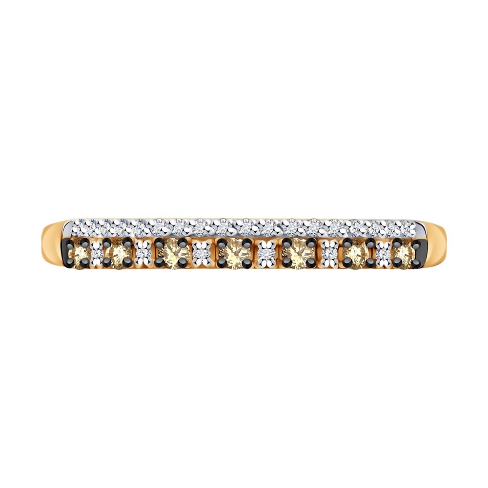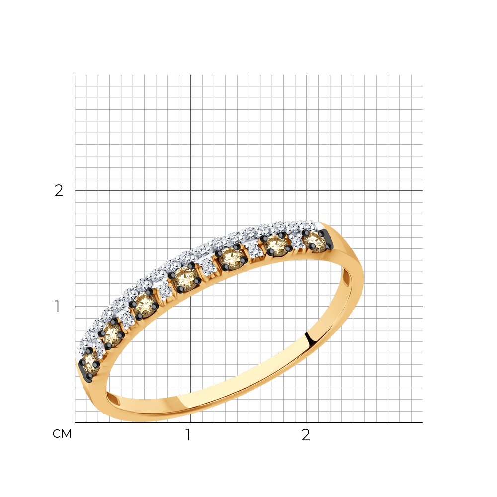 Изящное кольцо из красного золота 585 пробы декорировано сияющими дорожками прозрачных и коньячных бриллиантов. Утонченное кольцо с завораживающим блеском драгоценных камней очень женственно и привлекательно смотрится, и не оставит девушку равнодушной. Приобретайте ювелирное украшение в подарок по выгодной цене в магазинах Мир Золота.