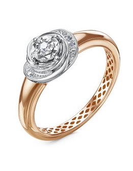 Изысканное кольцо из красного и белого золота 585 пробы с 13 бриллиантами в оригинальном стильном дизайне. Декоративная часть кольца изящно украшена искрящимися бриллиантами в обрамлении белого золота. Украшение подчеркнет шарм и изысканность женственного образа. Приобретайте превосходное кольцо по выгодным ценам в магазинах Мир Золота.