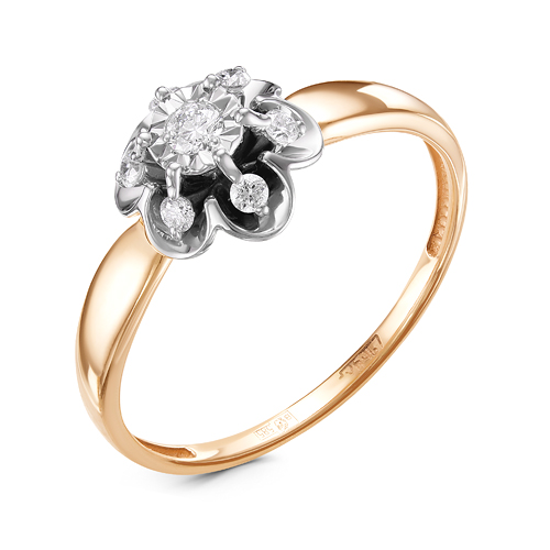 Нежное кольцо, выполненное в флористическом стиле, привлекает внимание необычным сочетанием теплого оттенка красного золота и прохладного блеска белого металла. Кольцо напоминает распустившийся цветок с элегантными лепестками, украшенными танцующими бриллиантами в закрепке специальной конструкции из белого золота. Благодаря такой уникальной технике крепления, драгоценные камни создают волшебную иллюзию живых капель росы, блестящих на солнце, делая кольцо воздушным и игривым украшением.