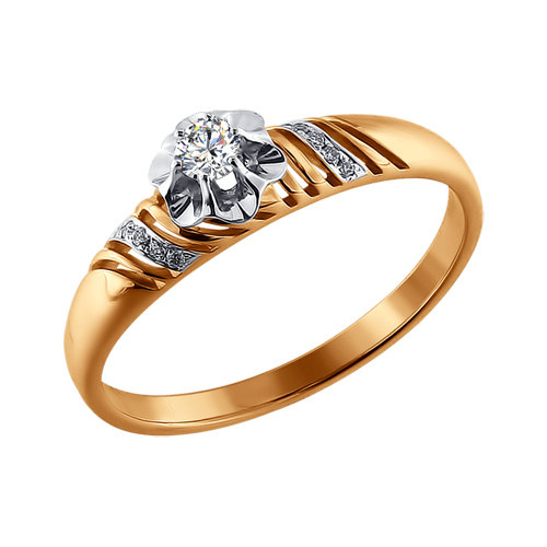 Изысканное кольцо из красного золота 585 пробы с бриллиантами, выполненное в необычном дизайне. Сияние центрального камня и дорожек бриллиантов оригинально подчеркнуто элементами из белого золота. Украшение при желании можно дополнить лаконичными аксессуарами. Приобретайте оригинальное кольцо выгодно в магазинах Мир Золота.