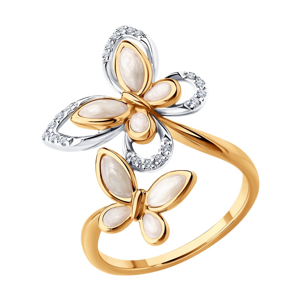 Декоративное женское кольцо из красного золота поражает своей красотой и элегантностью. Центральную часть украшают изящные бабочки из эмали. Драгоценные прозрачные бриллианты мягко переливаются и подчёркивают их волшебный облик. Такое кольцо станет изысканным подарком, подходящим как для особых поводов, так и для ежедневного ношения.