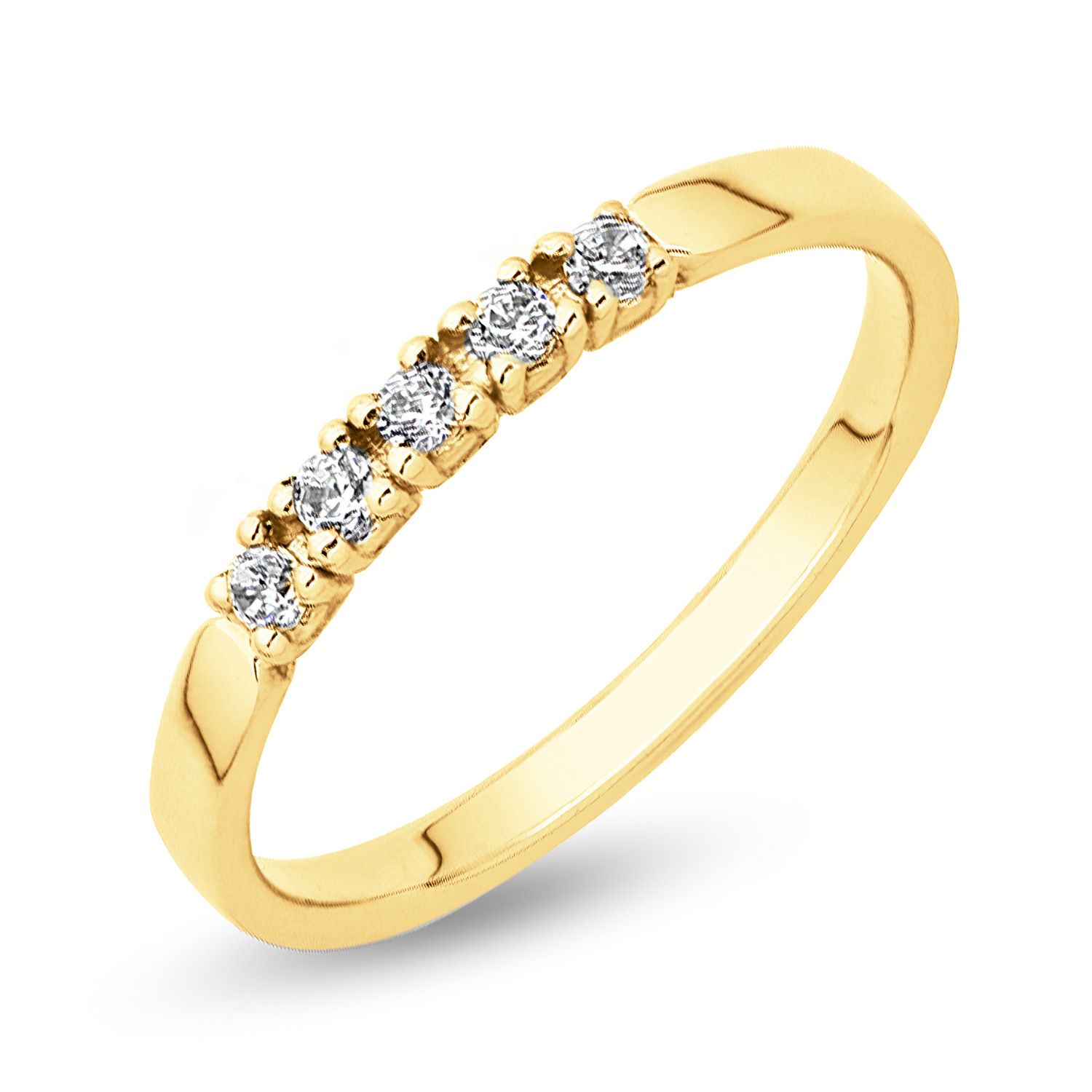 Женское кольцо, выполненное из желтого золота 585 пробы, словно светится ярким сиянием. В центре кольца изящно расположена дорожка из пяти ослепительных бриллиантов, каждый из которых переливается множеством огней при попадании света. Эти сверкающие камни, идеально подобранные по размеру и форме, создают эффект непрерывной линии, напоминающей звездную россыпь на ночном небе.