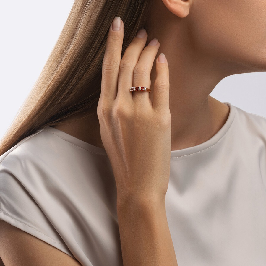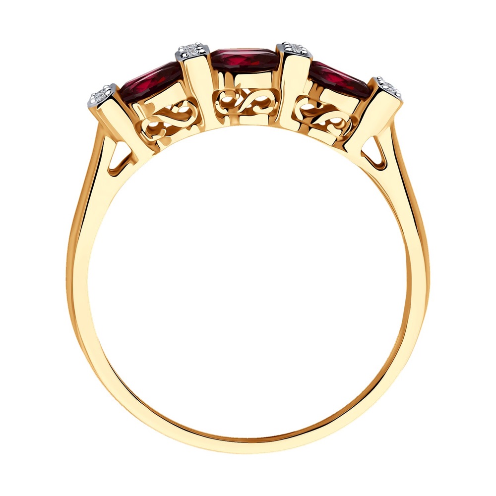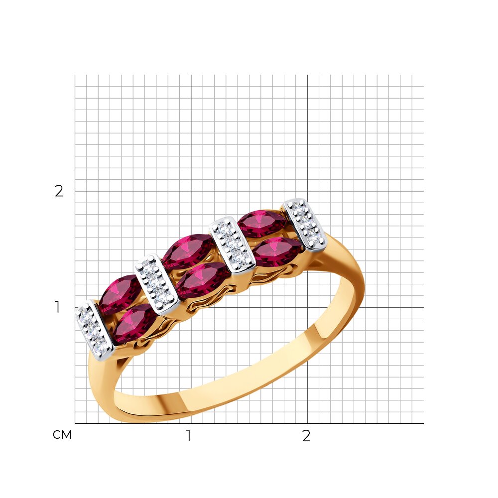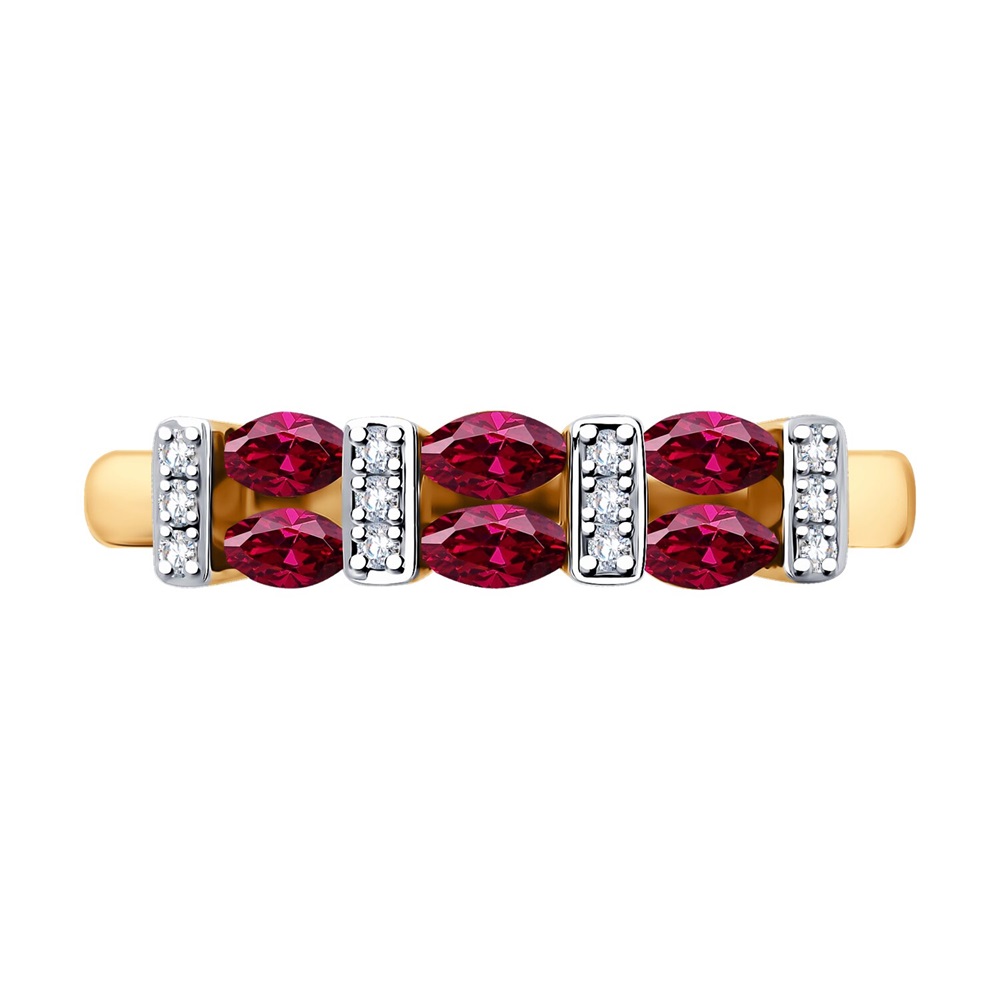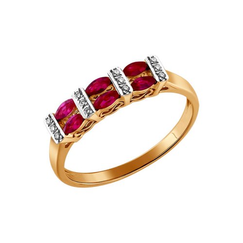 Изысканное кольцо из красного золота 585 пробы с натуральными рубинами утонченной формы огранки и сияющими бриллиантами подчеркнет истинную женственность и очарование владелицы. Яркое и элегантное украшение привлекательного дизайна будет идеальным выбором для вечернего и праздничного образа. Приобретайте кольцо в подарок по выгодной цене в магазинах Мир Золота.