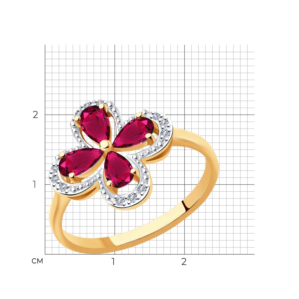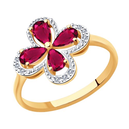 Восхитительное кольцо из красного золота 585 пробы с натуральными рубинами привлекательной формы огранки в обрамлении сияющих бриллиантов будет идеальным выбором современной леди. Украшение актуального дизайна в виде символичного клевера станет ярким акцентом стильного образа, и подчеркнет изысканный вкус обладательницы. Приобретайте украшение в подарок по выгодной цене в магазинах Мир Золота.