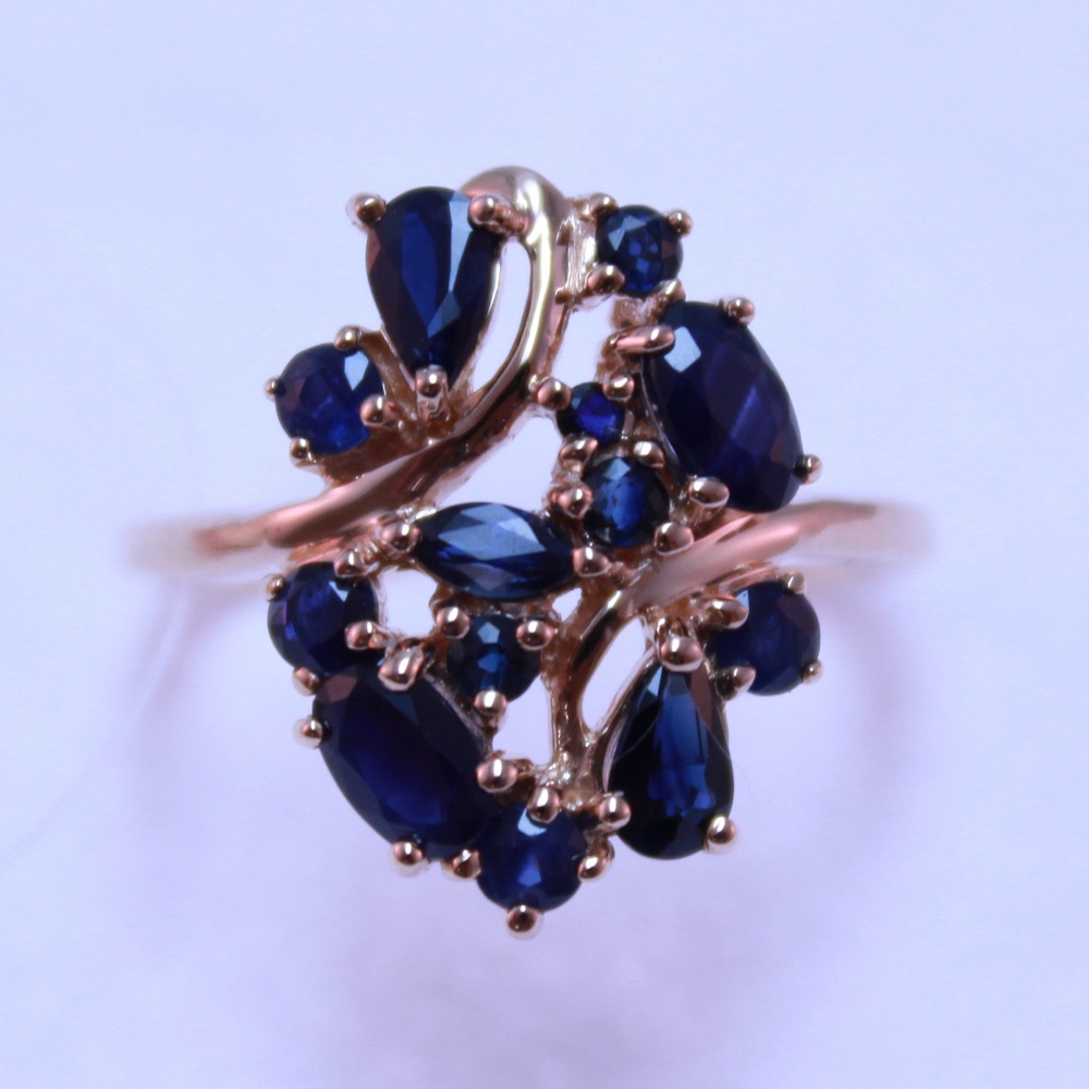Восхитительное кольцо изящного ювелирного дизайна с россыпью натуральных сапфиров различной формы огранки выполнено из красного золота 585 пробы. Притягательный блеск драгоценных камней завораживает взгляд, и делает украшение великолепным акцентом вечернего или праздничного образа. Приобретайте кольцо в подарок по выгодной цене в магазинах Мир Золота.