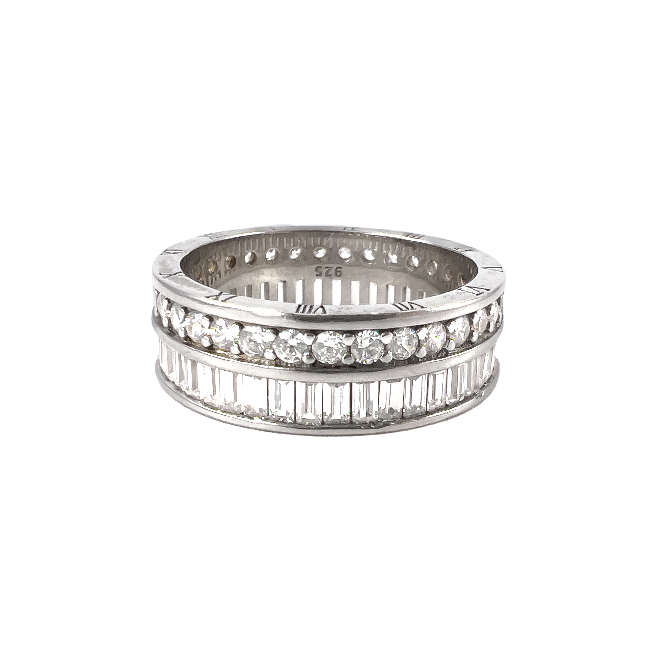 Роскошное женское кольцо выполнено из серебра 925 пробы и декорировано чарующими фианитами различной огранки. Главной особенностью украшения является циферблат - сочетание расположенных по кругу римских цифр, имеющих символичный и эстетический смысл для своей обладательницы. Такое кольцо идеально подойдет для праздничного образа. Порадуйте себя или купите в подарок это изысканное кольцо в магазинах Мир Золота.