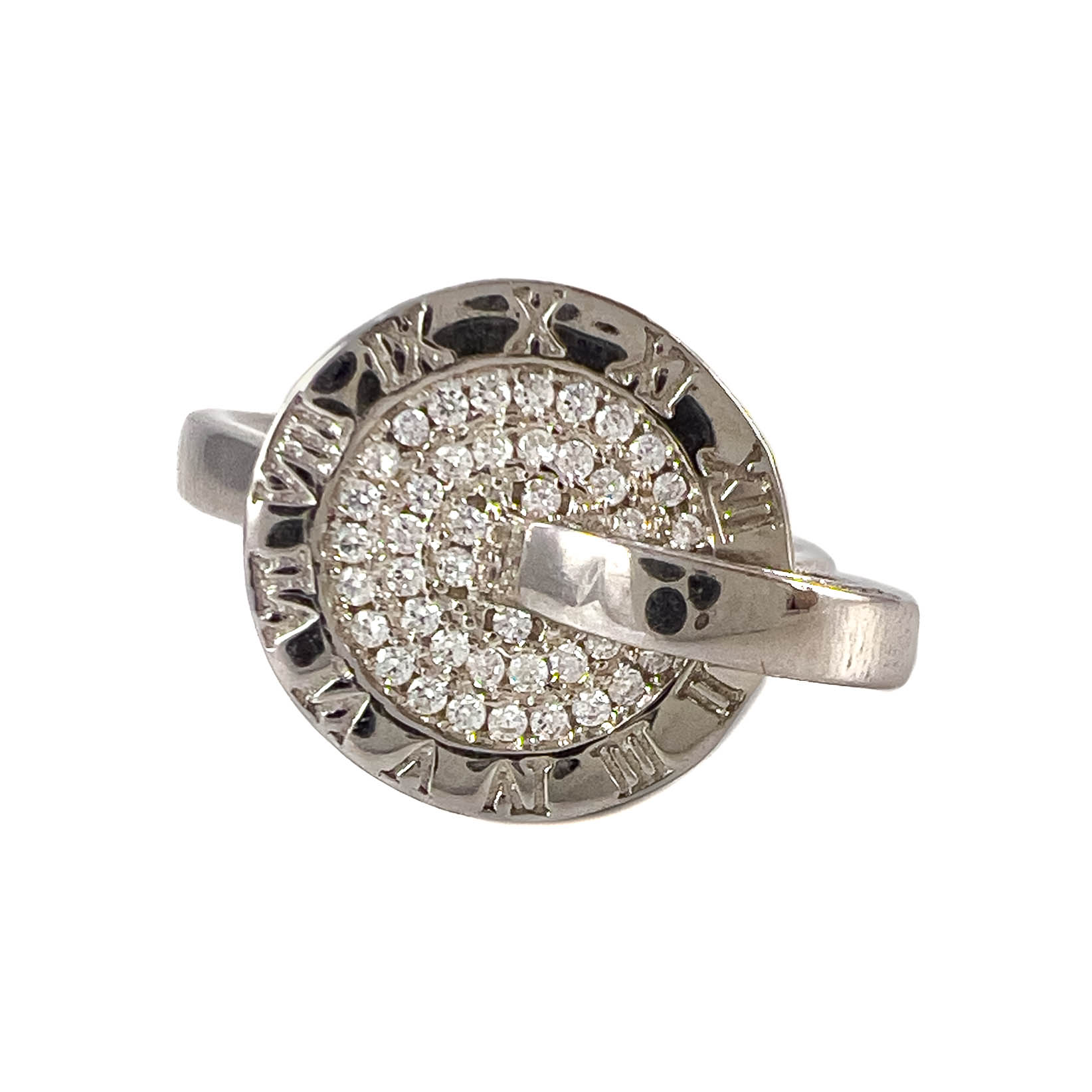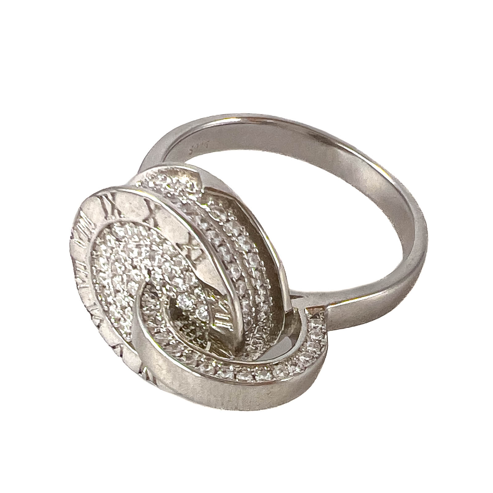 Роскошное женское кольцо необычной объемной формы выполнено из серебра 925 пробы и декорировано россыпью фианитов круглой огранки. Главной особенностью украшения является циферблат - сочетание расположенных по кругу римских цифр, имеющих символичный и эстетический смысл для своей обладательницы. Такое кольцо идеально подойдет для праздничного образа. Порадуйте себя или купите в подарок это изысканное кольцо в магазинах Мир Золота.