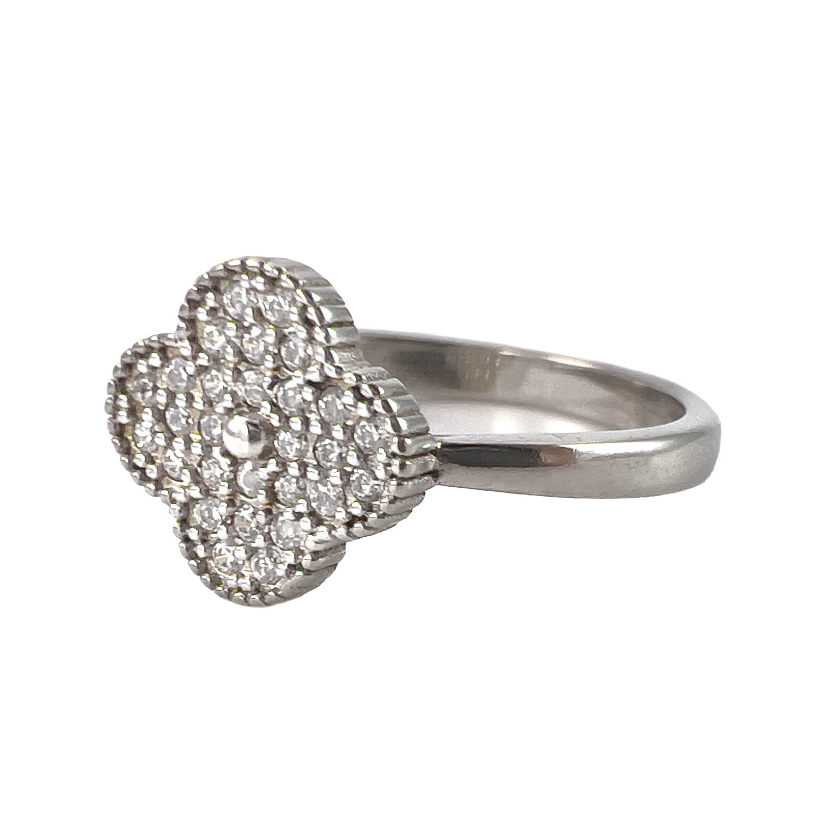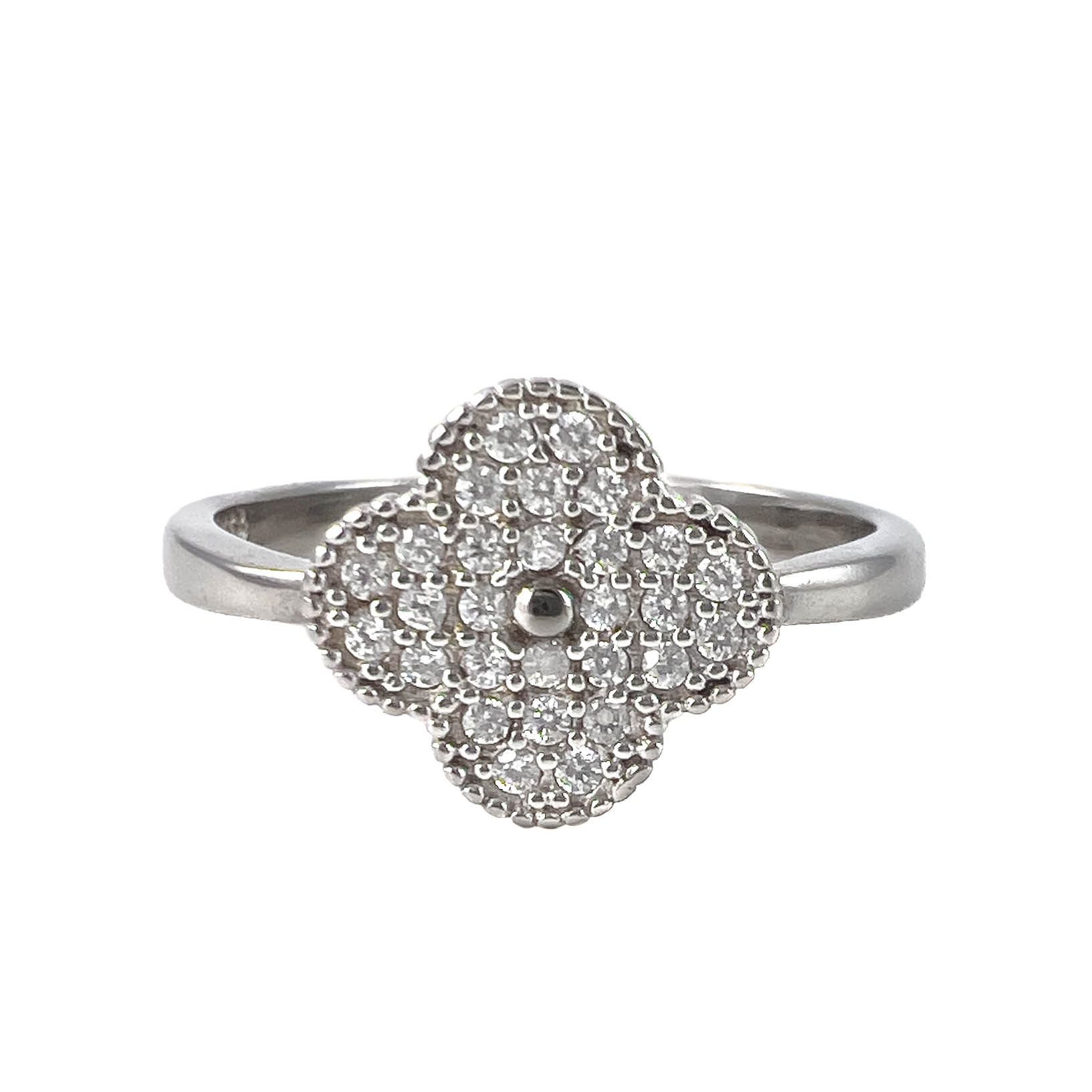Кольцо из яркого серебра 925 пробы в виде четырехлистного клевера олицетворяет неподвластный времени символ удачи. Это очень изысканное ювелирное украшение, которое подчеркнет чувственность - идеальный подарок мечтательной и творческой натуре. Мягкие линии металла, обрамляющие паве из сияющих фианитов, подчеркивают природную красоту и роскошь камней. Купите чувственное кольцо по привлекательной цене в магазинах Мир Золота.