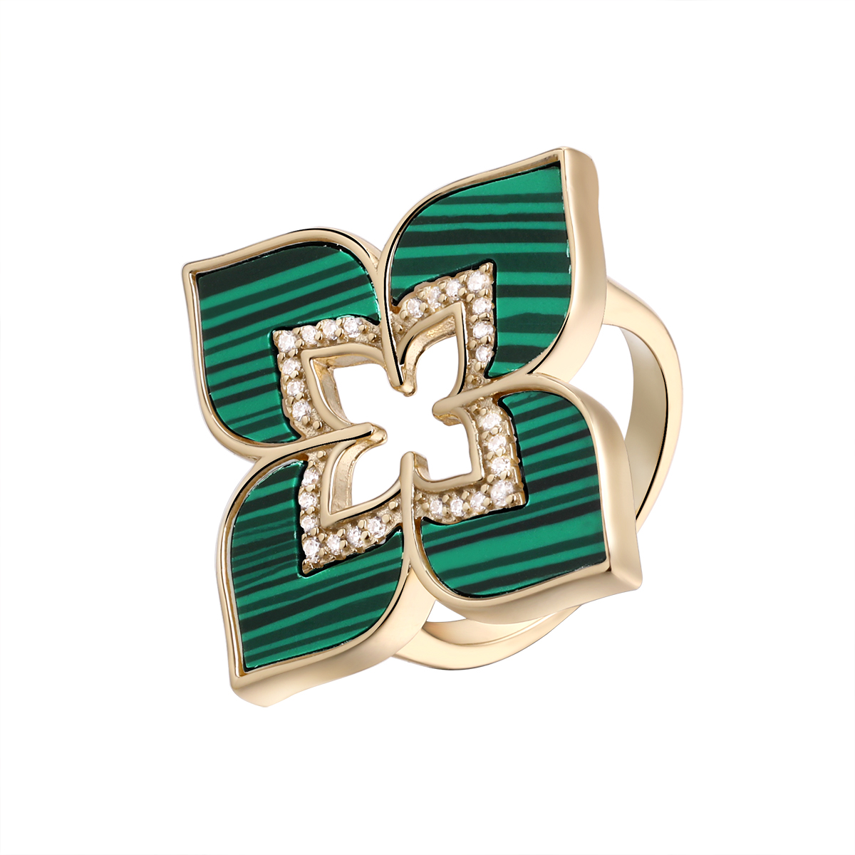 Кольцо из позолоченного серебра с искусственным малахитом и фианитами
