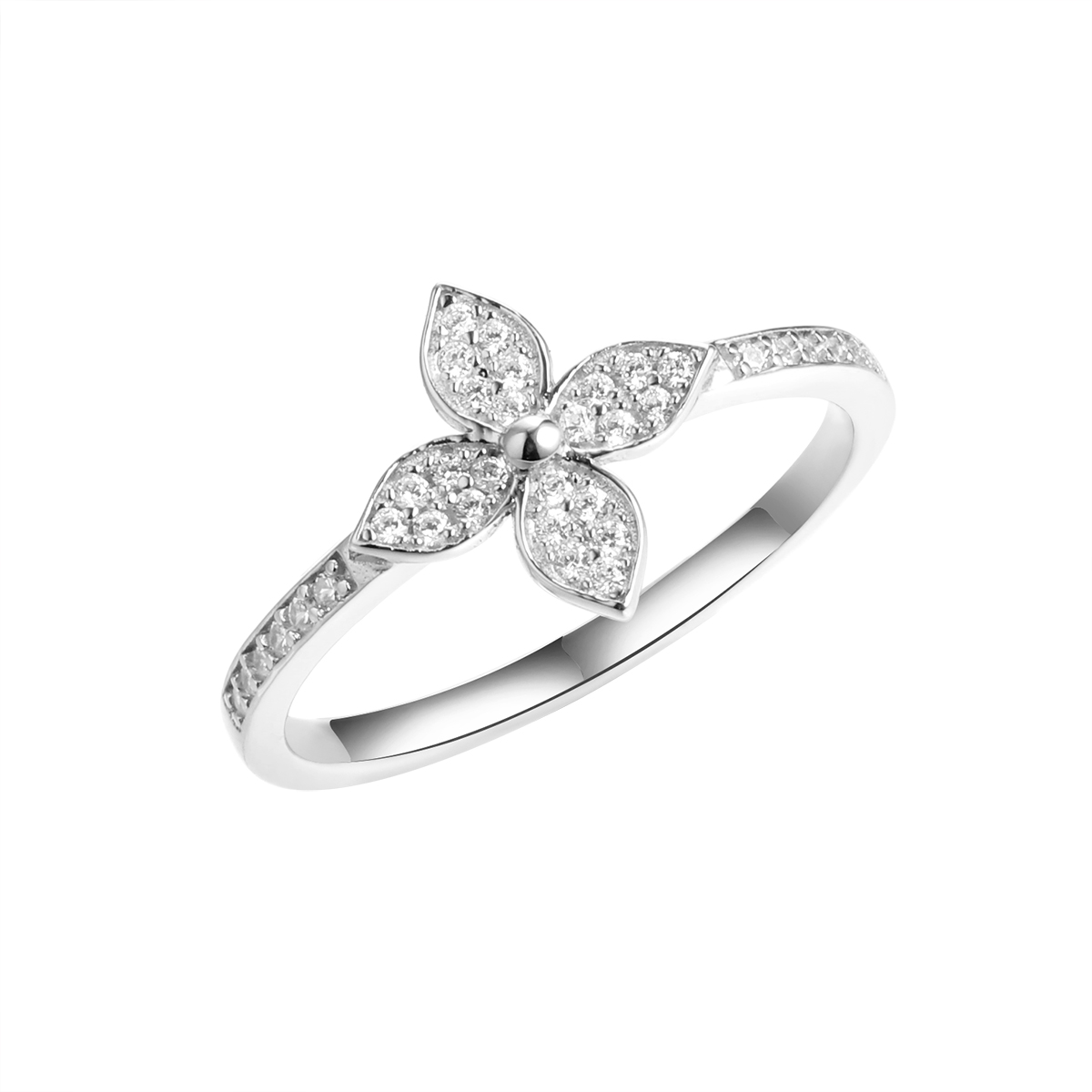 Очаровательное кольцо из родированного серебра 925 пробы, украшенное россыпью сияющих фианитов, не оставит девушку равнодушной. Флористический дизайн с привлекательным блеском кристальных камней на фоне серебристого металла позволит создать нежный романтичный образ, и подарит летнее настроение. Приобретайте симпатичное кольцо по выгодной цене в магазинах Мир Золота.
