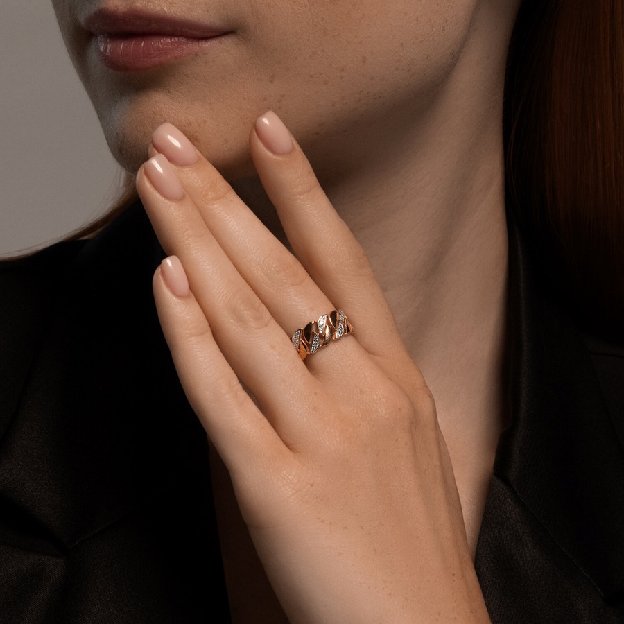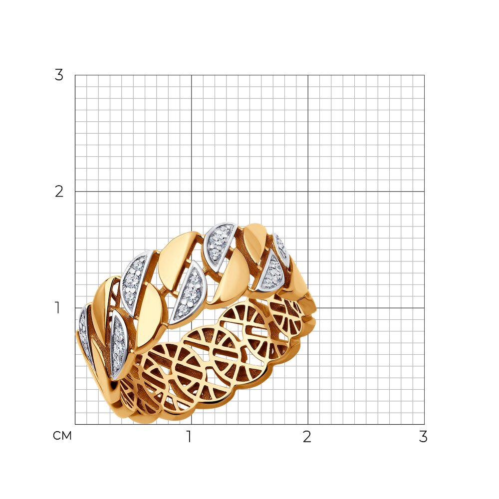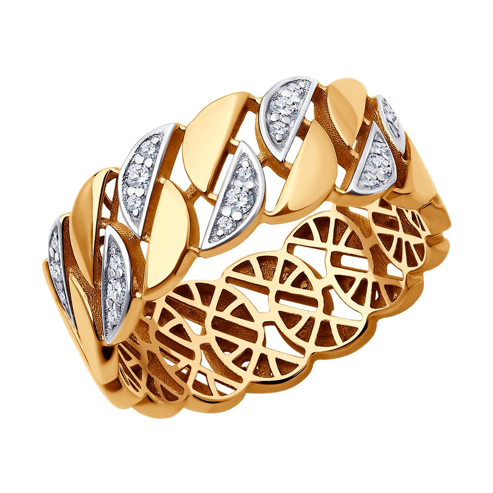 Великолепное кольцо изысканного ювелирного дизайна, украшенное вставками с прозрачными фианитами, выполнено из красного золота 585 пробы. Объемное кольцо с кристальным блеском фианитов эффектно смотрится на руке, и станет выразительным акцентом современного образа. Приобретайте ювелирное украшение в подарок по привлекательной цене в магазинах Мир Золота.