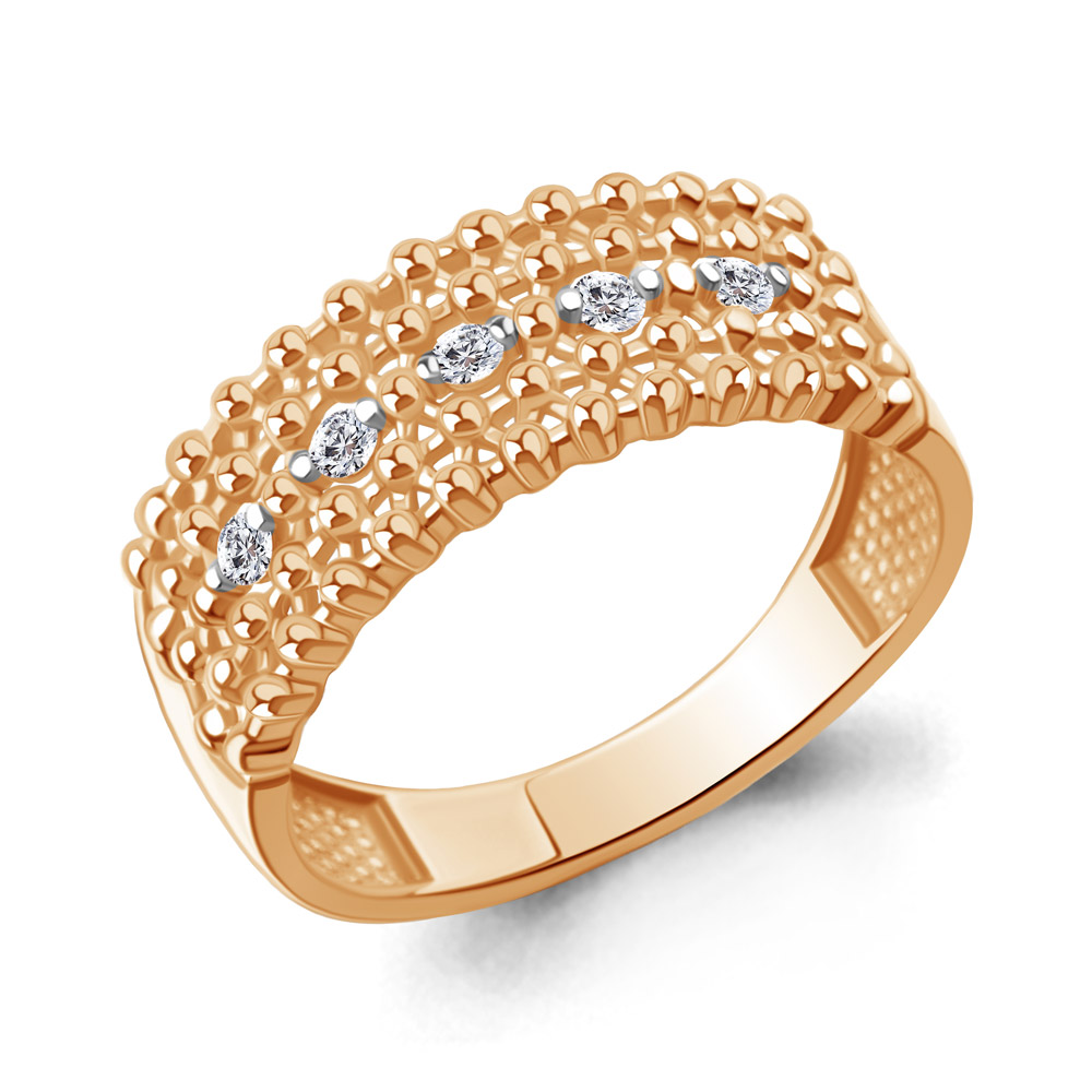 Привлекательное кольцо интересного ювелирного исполнения из красного золота 585 пробы украшено сияющими фианитами. Драгоценное золото акцентирует кристальные фианиты и выгодно подчеркивает их холодный блеск. Эффектное украшение великолепно смотрится на руке, и будет замечательным подарком для женщины. Приобретайте актуальное украшение по выгодной цене в магазинах Мир Золота.