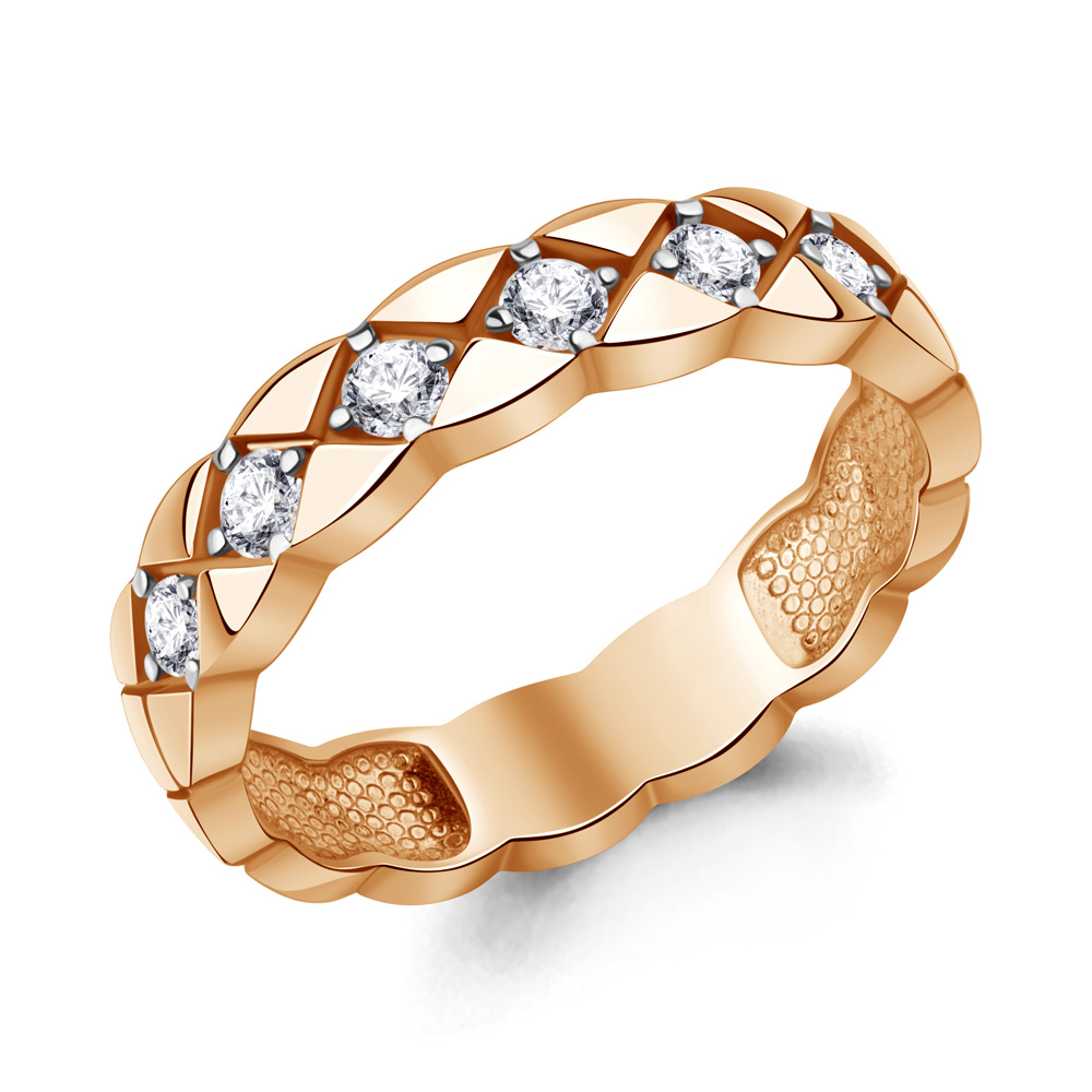 Эффектное кольцо привлекательного ювелирного дизайна из красного золота 585 пробы декорировано дорожкой сияющих фианитов. Стильный аксессуар станет выразительным акцентом современного образа, и подчеркнет изысканный вкус обладательницы. Приобретайте актуальное украшение в подарок по выгодной цене в магазинах Мир Золота.