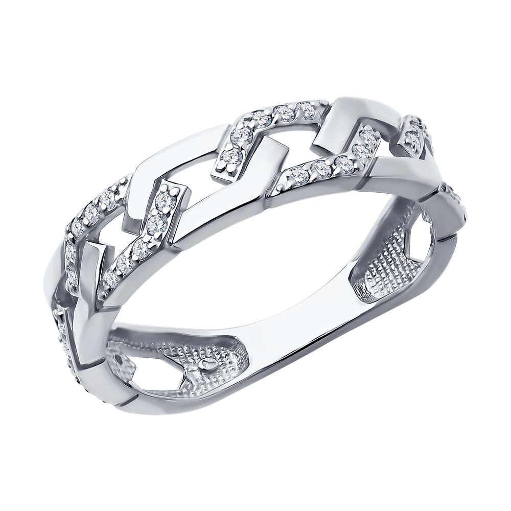 Стильное кольцо выполнено в современном ювелирном дизайне из белого золота 585 пробы с дорожками прозрачных фианитов. Эффектное сочетание холодного оттенка золота с чистым кристальным блеском камней привлекает внимание. Украшение универсального дизайна комфортно в повседневной носке, и станет актуальным дополнением динамичных городских образов. Приобретайте кольцо для себя или в подарок по выгодной цене в магазинах Мир Золота.