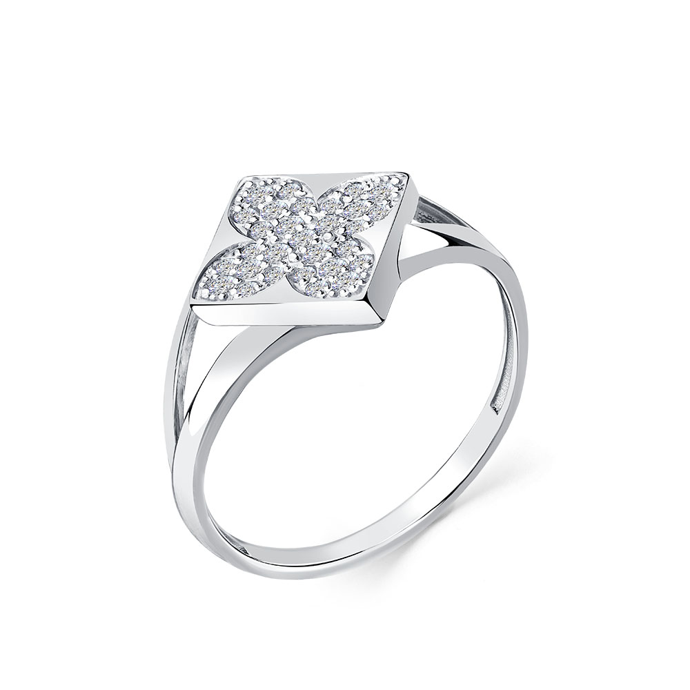 Стильное кольцо из белого золота 585 пробы украшено вставкой в форме клевера с россыпью сверкающих фианитов. Актуальный дизайн с мерцающим блеском ювелирных камней отлично впишется в современные образы, и подчеркнет очарование и женственность владелицы. Приобретайте украшение в подарок по выгодным ценам в магазинах Мир Золота.