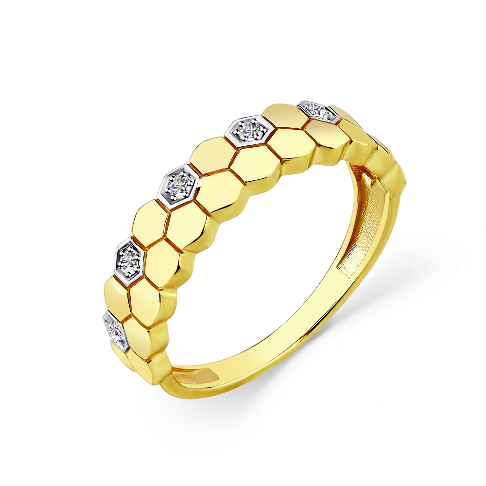 Кольцо интересного ювелирного дизайна из желтого золота 585 пробы с сияющими фианитами станет стильным дополнением современного образа. Украшение с искристым блеском камней внесет нотку оригинальности в привычный повседневный образ, и подчеркнет индивидуальность владелицы. Приобретайте изысканное украшение в подарок по выгодным ценам в магазине Мир Золота.