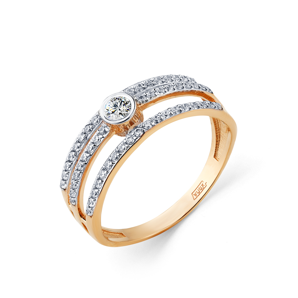Кольцо из красного золота 585 пробы украшено дорожками сверкающих фианитов. Элегантное украшение с искристым блеском камней станет привлекательной деталью женского образа, и отлично впишется в современный стиль. Приобретайте ювелирное украшение для своей коллекции или в подарок по выгодной цене в магазинах Мир Золота.