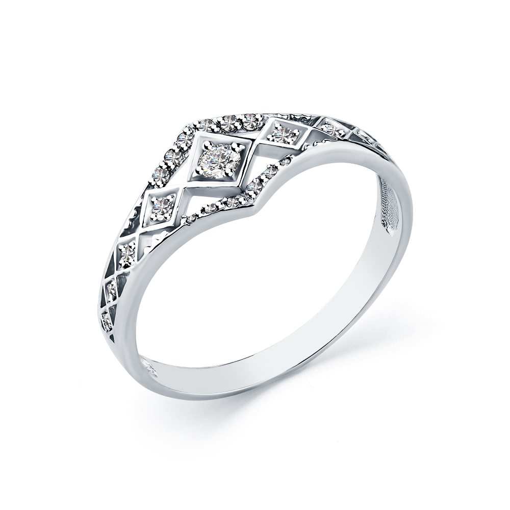 Изысканное кольцо современного ювелирного дизайна, декорированное сияющими фианитами, выполнено из белого золота 585 пробы. Холодный оттенок драгоценного золота выгодно подчеркивает кристальный блеск ювелирных камней. Приобретайте ювелирное украшение для себя или в подарок по привлекательной цене в магазинах Мир Золота.