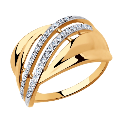 Кольцо из красного золота 585 пробы с дорожками искристых фианитов займет достойное место в ювелирной коллекции владелицы. Элегантное объемное кольцо с кристальным блеском камней привлекает внимание, и станет выразительной деталью современного образа. Приобретайте ювелирное украшение по выгодной цене в магазинах Мир Золота.
