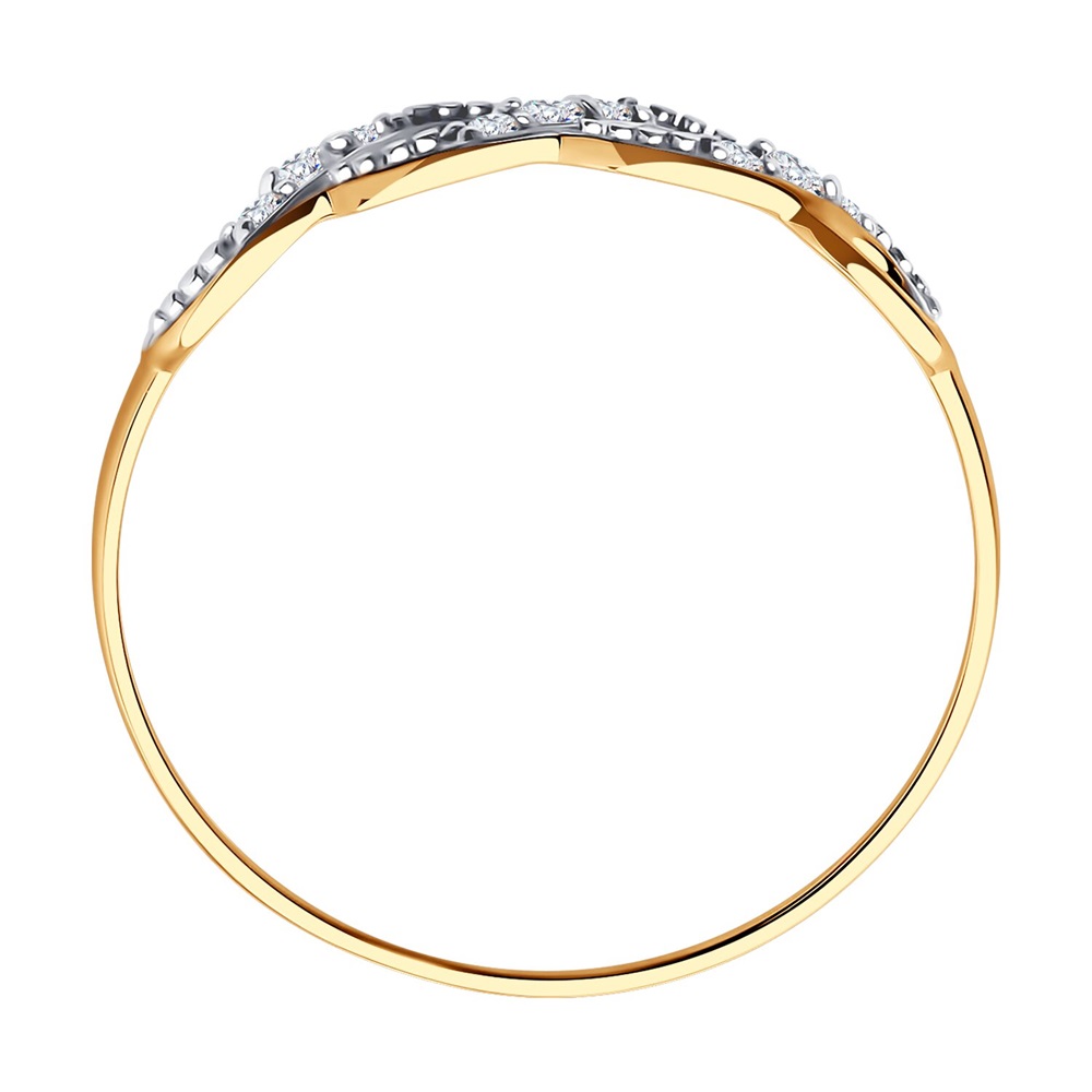 Элегантное кольцо изящного ювелирного дизайна с дорожками искристых фианитов выполнено из красного золота 585 пробы. Украшение с изумительным блеском ювелирных камней в закрепках из белого золота сделает образ более женственным и привлекательным. Приобретайте кольцо в подарок по выгодной цене в магазинах Мир Золота.