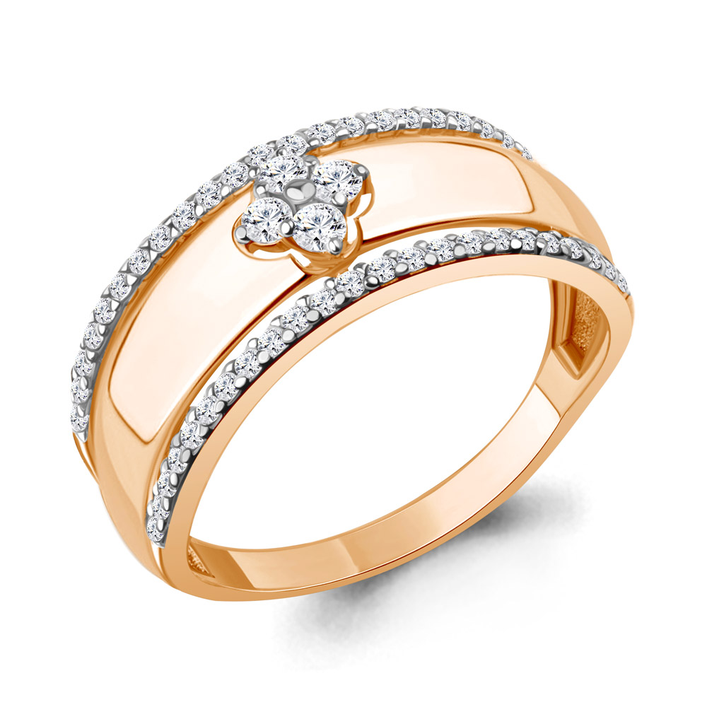 Широкое кольцо из красного золота 585 пробы в классическом стиле с дорожкой фианитов и центральной акцентной вставкой в виде клевера станет символом элегантности любой женщины. Оно подойдет тем, кто ценит роскошь и эксклюзивность. Приобретайте ювелирное кольцо AQUAMARINE по выгодным ценам в магазинах Мир Золота.
