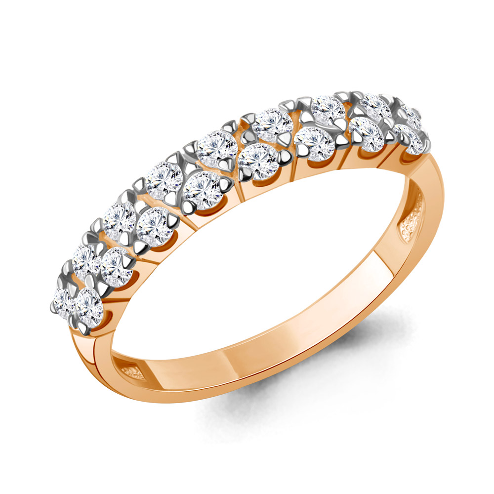 Изысканное кольцо современного ювелирного дизайна, декорированное сияющими фианитами, выполнено из красного золота 585 пробы. Теплый оттенок драгоценного золота выгодно подчеркивает кристальный блеск ювелирных камней. Приобретайте украшение для себя или в подарок по привлекательной цене в магазинах Мир Золота.