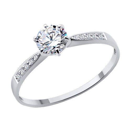 Изысканное помолвочное кольцо выполнено из белого золота. Центральный фианит, окруженный мелкими камнями, сверкает яркими бликами, символизируя чистоту и светлое будущее пары. Круглая огранка камней идеально передает свет, делая кольцо особенно привлекательным. Это украшение станет незабываемым символом любви и верности, который будет радовать свою обладательницу каждый день.