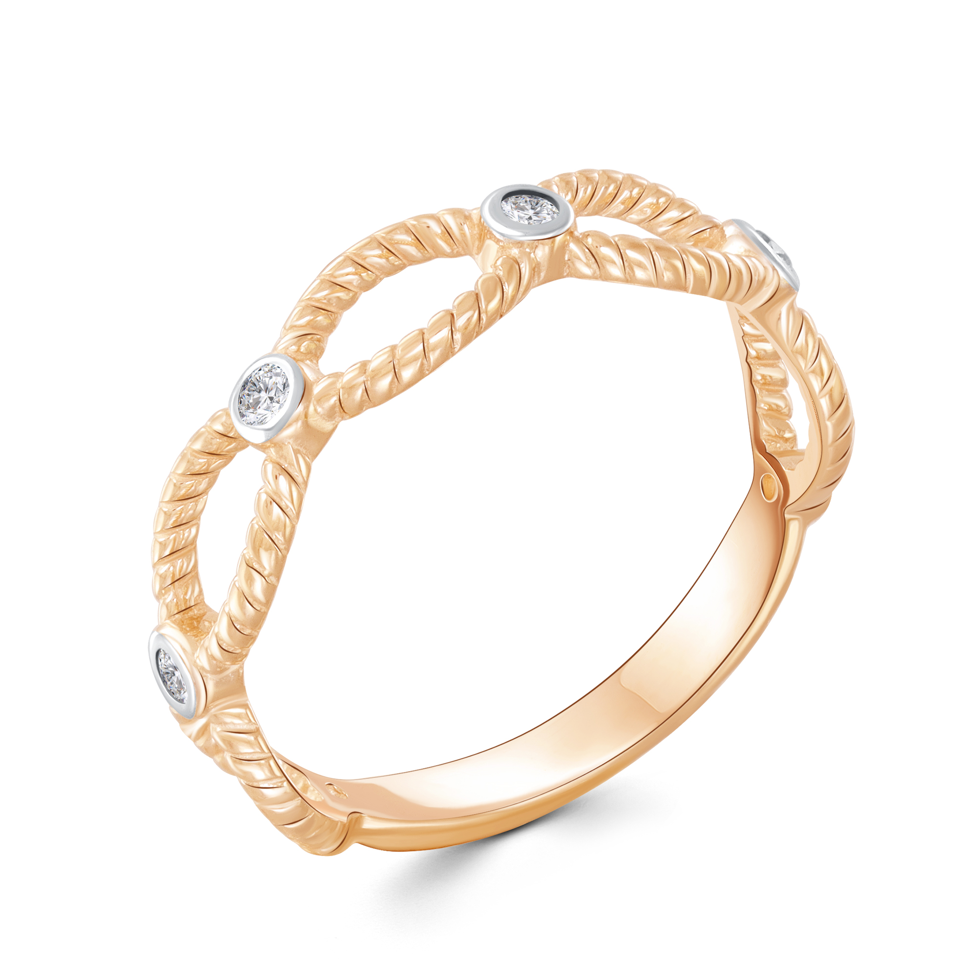 Кольцо из красного золота с фианитами, выполненное с имитацией каната, выглядит необычно и стильно. Узоры, напоминающие переплетение верёвок, придают изделию динамичность и объём, а фианиты добавляют яркости и игривости. Такое кольцо станет интересным акцентом в вашем образе, подчеркивая индивидуальность и хороший вкус.